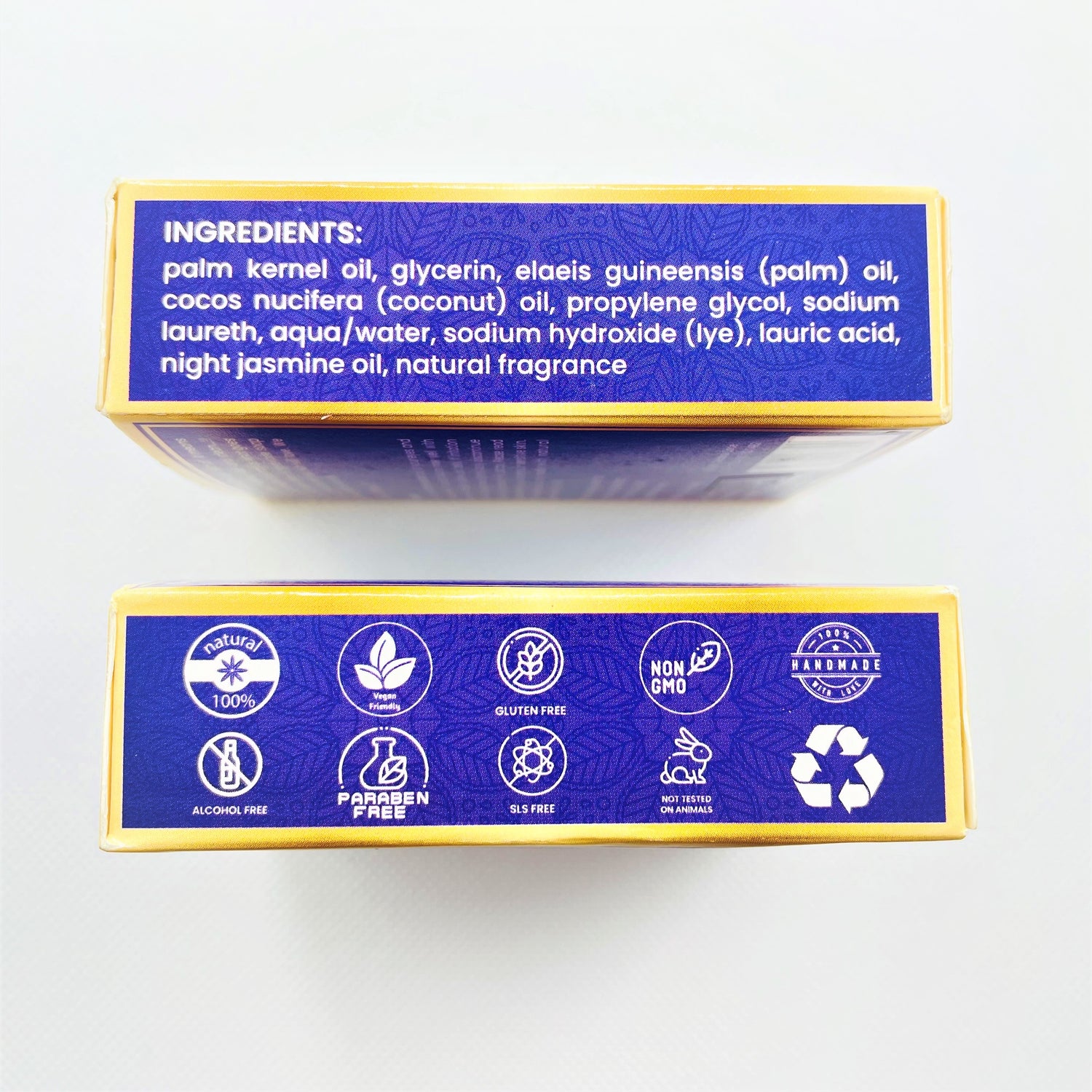 Ingredients: palm kernal oil, Glycerin, elaeis guineensis (palm) oil, cocos nucifera (coconut) oil, propylene glycol, sodium laureth, aqua/water, sodium hydroxide (lye), lauric acid, night jasmine oil, natural fragrance