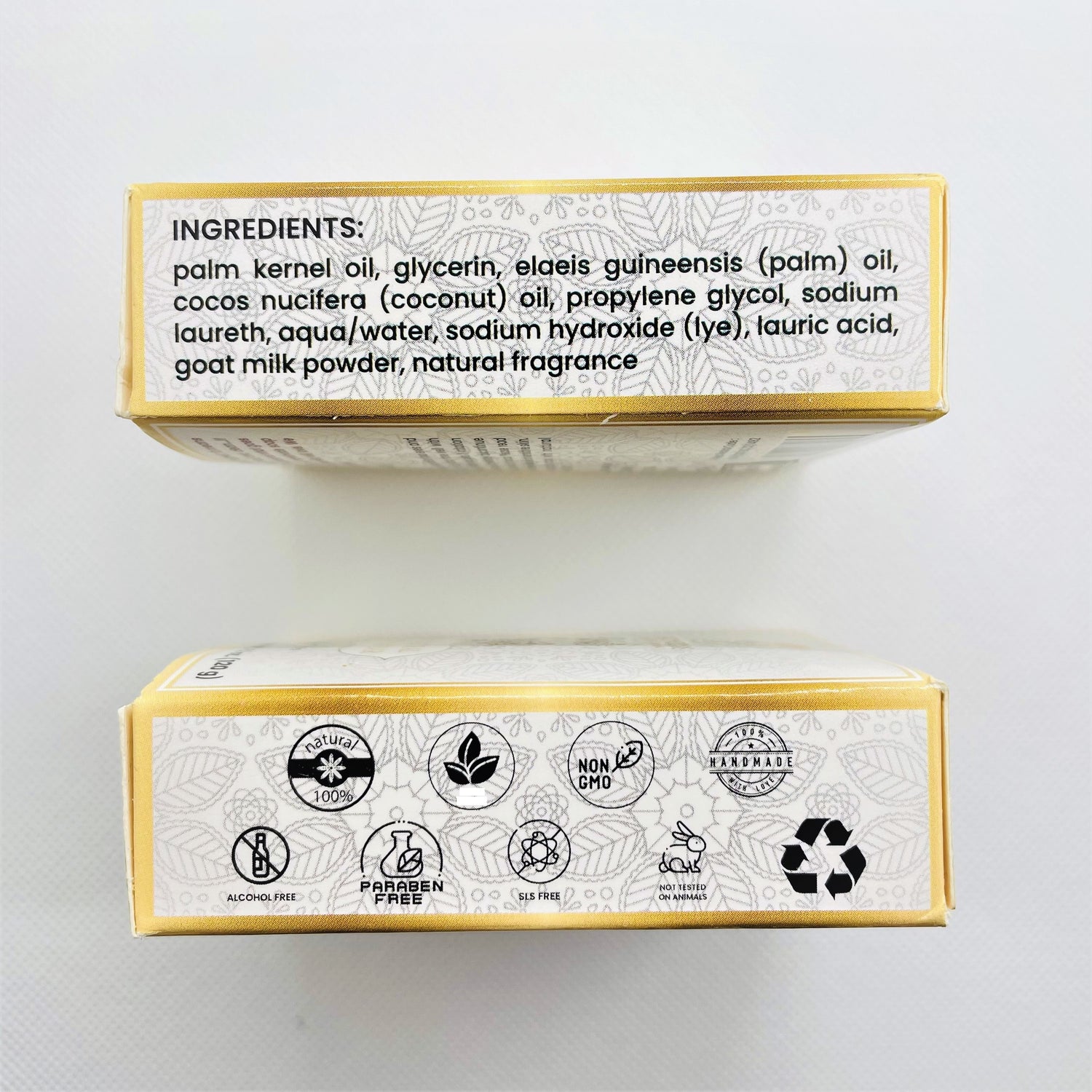 Ingredients: palm kernal oil, Glycerin, elaeis guineensis (palm) oil, cocos nucifera (coconut) oil, propylene glycol, sodium laureth, aqua/water, sodium hydroxide (lye), lauric acid, goat milk powder, natural fragrance