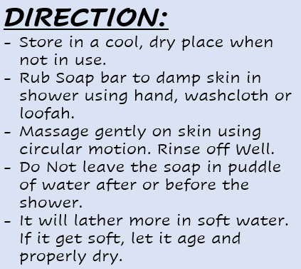 Direction: Store in a cool, dry place when not in use. Rub soap bar to damp skin in shower using hand, washcloths, or loofah. Massage gently on skin using circular motion. Rinse off well. Do not leave the soap in puddle of water after or before the shower. It will lather more in soft water. If it gets soft, let it age and dry properly.